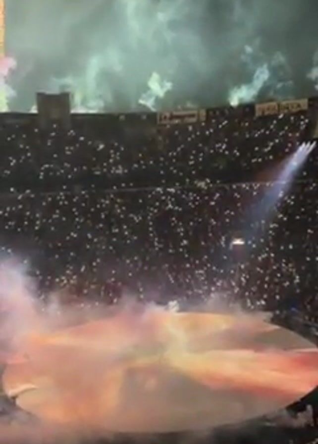 A concert is taking place inside a packed stadium. The stage is a large, circular platform surrounded by mist. A spotlight shines down from above. The audience is illuminated by the lights from their phones. Fireworks are going off above the stadium.