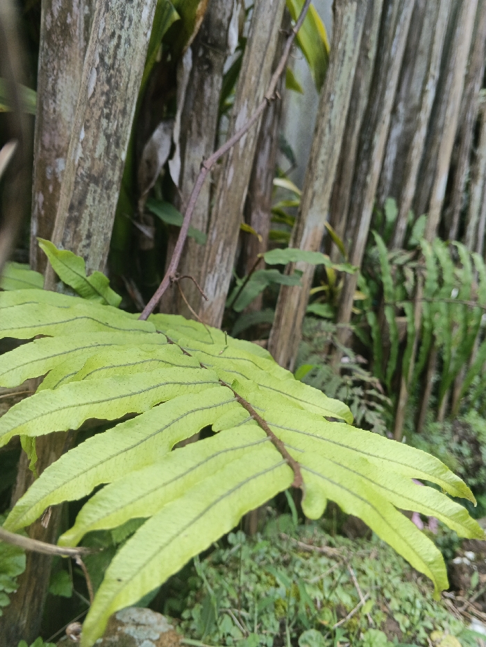A vibrant green fern with segmented fronds takes center stage. Dark lines mark each segment. Behind it, a weathered wooden fence or structure adds a rustic backdrop. A thin, brown vine winds its way through the scene, connecting the fern to the background. Smaller ferns and ground cover add depth and texture at the base. The scene suggests a natural, overgrown environment.