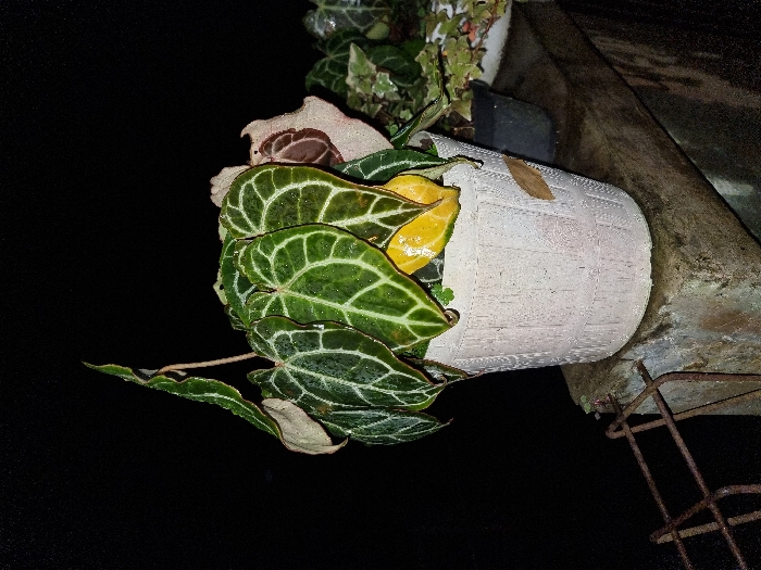 A single potted plant is centrally positioned on a wet concrete ledge in Pacet, Indonesia, under nighttime conditions. The plant features heart-shaped, dark green leaves with distinct white reticulated venation; several leaves display visible water droplets. One leaf in the lower-central area is entirely yellow, and another leaf towards the right exhibits a brown, damaged section. The plant is contained within a light-colored, vertically grooved pot, possibly constructed from concrete or similar material, with a small, light brown rectangular object adhered to its right side. To the immediate left of the pot, a rusty metal grate structure is partially visible. To the right and slightly behind, a second, smaller dark pot containing a different plant with variegated leaves rests on the same concrete ledge. The background is uniformly black, indicating illumination by an artificial light source in a dark environment. No individuals are present.