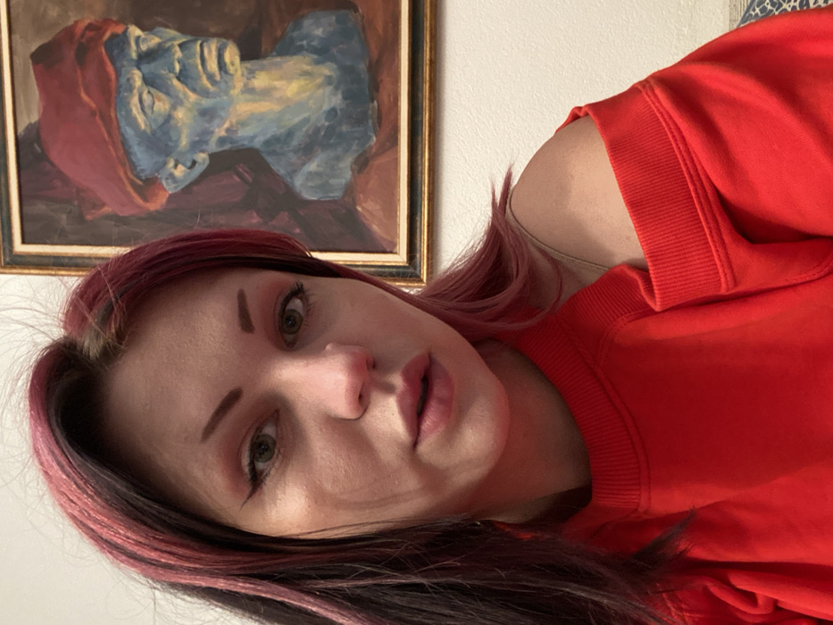 The image depicts a close-up indoor portrait of a female individual with a painting in the background. The scene appears to be located indoors in the city of Kunje, Montenegro. **Female Subject:** A female individual, appearing to be an adult, is positioned in the left and central parts of the frame, facing directly towards the camera. Her long, straight hair features a combination of dark brown and magenta/pink strands, parted slightly to the left. Her facial features include a light skin tone, light-colored eyes (appearing hazel or light brown) with distinct winged black eyeliner and light pink eyeshadow. Her eyebrows are dark, thin, and sharply arched. The bridge of her nose exhibits a slight redness. Her lips are full, colored with a light pink tone, and slightly parted. She is wearing a red, long-sleeved top with a ribbed crew neck. The right shoulder of the top is pulled down, exposing her bare shoulder and a visible beige bra strap. Her expression is neutral, with her gaze directed at the camera. **Background Environment:** The background consists of a plain, light-colored wall, likely off-white or cream. A framed oil painting is prominently displayed on this wall to the subject's right. The painting portrays a bust of a stylized male figure, rendered primarily in shades of blue and yellow, wearing a red turban-like head covering. The painting is enclosed within a gold-toned frame with darker accents. In the bottom right corner, a small section of dark blue fabric with a lighter pattern, possibly upholstery, is visible. The lighting is consistent with an indoor setting, likely artificial.