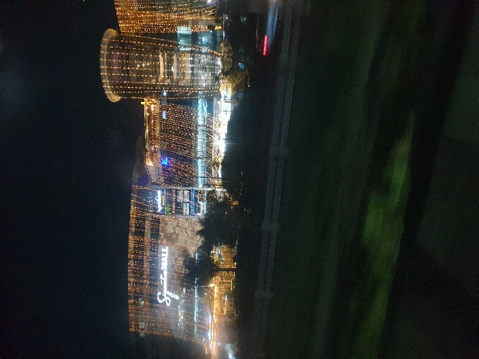 A multi-story building, labeled "S Square Mall," is illuminated with vertical strings of lights at night. A cylindrical structure tops a portion of the building, also covered in lights. The building's signage and surroundings are visible. To the right, a dark green area runs along the edge of the frame, contrasting with the bright facade of the mall.