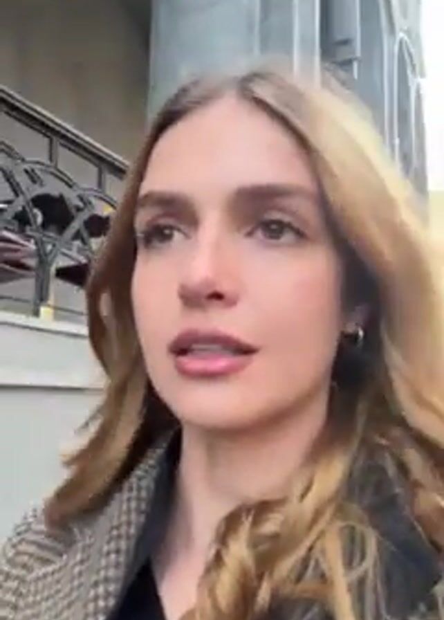 A woman walks outdoors in daylight. She has light brown hair and fair skin and is wearing a gray and brown plaid coat over a black shirt. She is looking into the camera, occasionally singing and playing with her hair. The background appears to be a building with gray walls and arched windows.