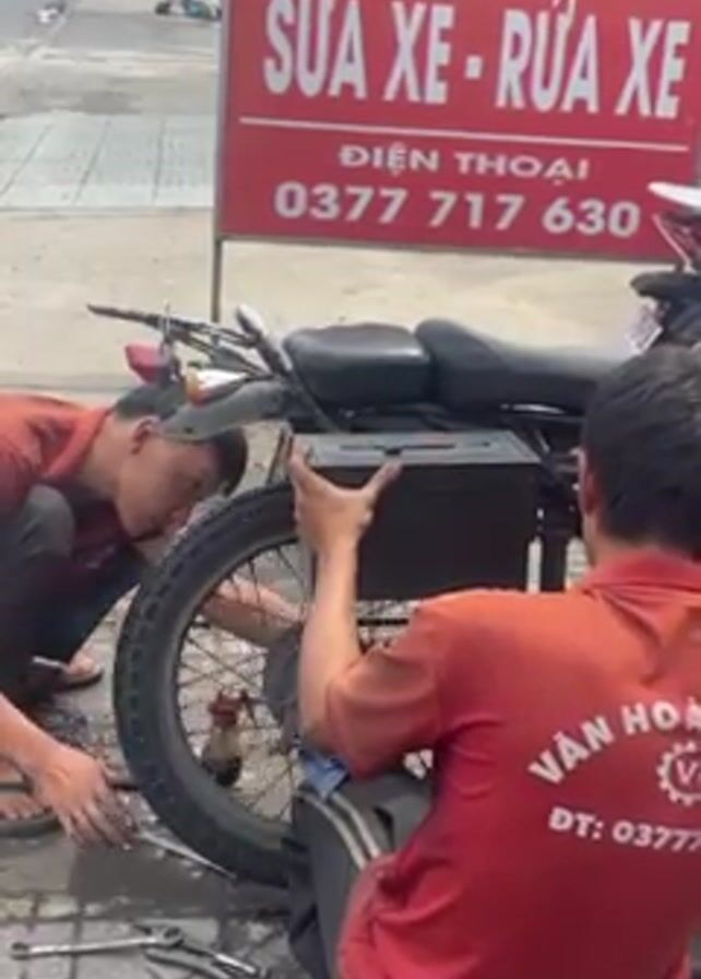 Two mechanics in red shirts are repairing the rear tire of a black motorcycle next to a red sign that advertises motorcycle repair and washing services with a phone number