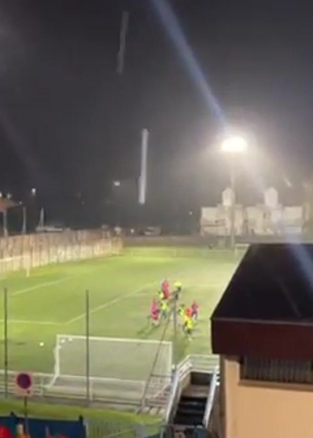 A soccer field is visible at night, lit by bright stadium lights. Several people wearing neon-colored athletic wear are gathered on the field, seemingly engaged in a drill or practice. The weather appears to be rainy or snowy. The perspective is from an elevated position, possibly a building adjacent to the field. A colorful mural is visible on a wall in the foreground.