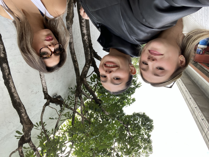 Three women stand in a group, leaning into the camera, which is positioned below them. The woman on the left wears glasses and a white tank top. The woman in the middle smiles, sporting a black jacket. To the right, a third woman smiles, also wearing a black jacket over a white top. Tree branches, some with green leaves, fill the space between and behind them. A white wall is visible in the background on the left side of the image.