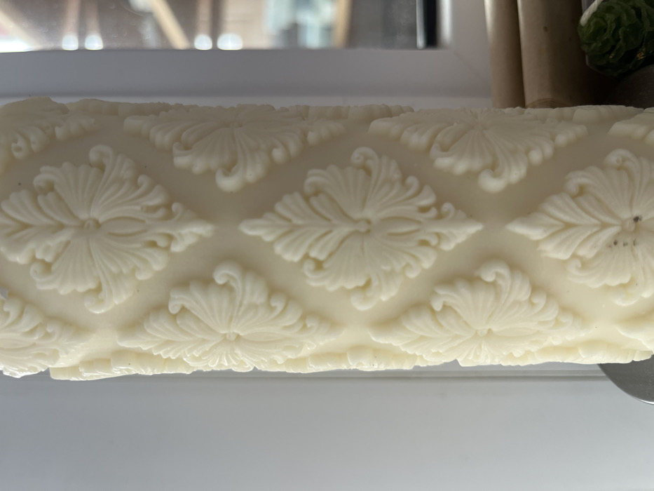 The image displays a cream-colored, cylindrical decorative candle in a vertical, close-up shot. The candle is adorned with an intricate, raised, repeating pattern of rococo-style floral or acanthus leaf motifs, forming a diamond-shaped grid. Small dark inclusions are visible on the carved surface. In the blurred background to the right, light-colored cylindrical objects are present, alongside a small, dark green, textured item, possibly a carved wax ornament or a miniature pinecone. A metallic edge is partially visible at the lower left. Illumination is provided by a diffused light source on the left and a blurred window on the right, indicating an indoor setting. No individuals or actions are depicted. The specific location within Krasnodar, Russia, cannot be determined from the visual information provided.