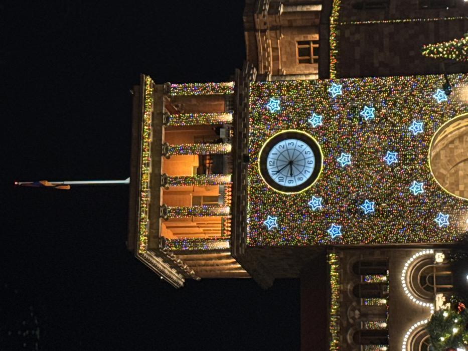 A building is seen at night, decorated with Christmas lights in many colors and star shapes. A clock face is visible on the building's facade, showing the time at approximately 8:30. The building has an architectural style of light brown stonework, with columns and arches, and is illuminated in various shades of yellow and orange. A flag on a pole extends from the building.
