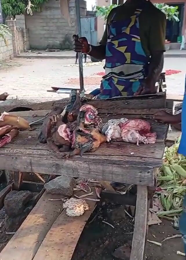 A man is working at an outdoor meat stand, under an umbrella. He wears a multicolored apron and a dark shirt. On the table are pieces of raw meat, including what looks like goat heads, cut in half, and other butchered pieces. A woman stands to the right of the table wearing a blue shirt and ripped jeans, seemingly waiting for a purchase. She points at the meat. The stand is made of weathered wood and sits on a makeshift base of rocks and boards. Corn on the cob sits at the edge of the table and on the ground beside it. The background shows a street, brick walls and a building, and some greenery.