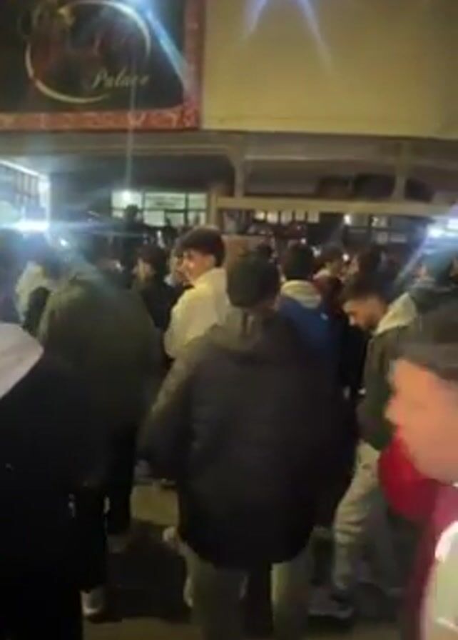 crowd of people outside a building that appears to be a club or venue called "Palace." The crowd seems to be in a festive or celebratory mood. The scene is at night, illuminated by lights from the building and surrounding area. People are wearing a variety of casual clothes, including jackets, hoodies, and sweaters. They are moving around and talking, suggesting a lively atmosphere. The camera moves through the crowd, providing a view of different individuals and the overall scene.