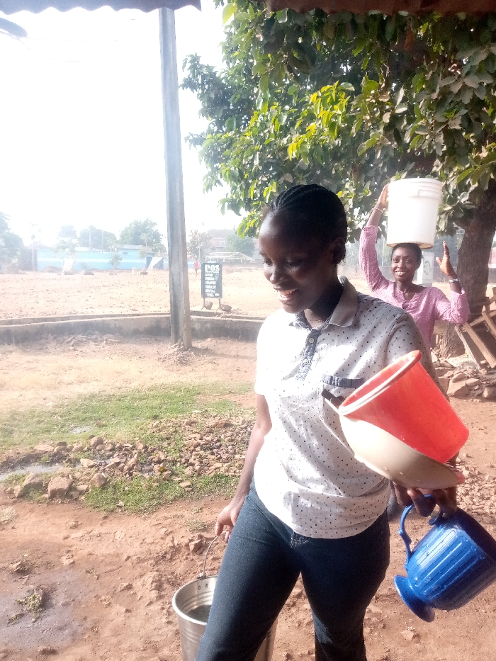 Two smiling African women are outdoors in bright daylight. The woman in the foreground carries a metal bucket, a red plastic bucket, and a blue pitcher. She wears a white patterned polo shirt and dark jeans. Behind her, another woman balances a white bucket on her head, both arms raised with palms up. The background shows a dirt road, a sign labeled “POS,” a concrete structure, and trees.