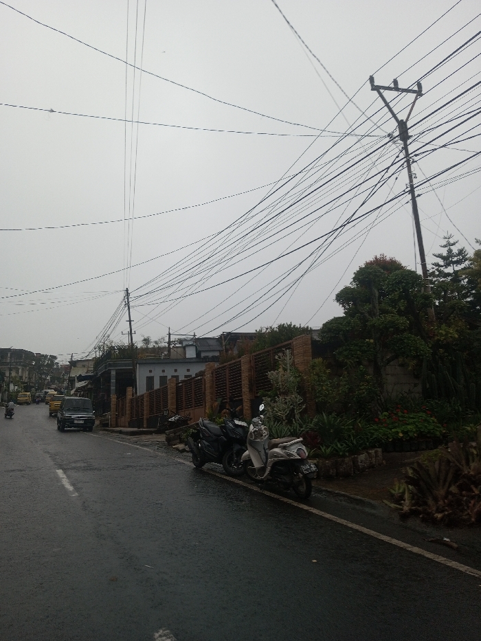 The scene depicts a street in Babaliya Mal., India, under an overcast sky. The asphalt road surface is visibly wet. A prominent wooden utility pole with multiple crossarms stands on the right side of the frame, supporting an extensive network of dark electrical and communication wires that crisscross the sky. Two scooters are parked on the wet shoulder to the right: one dark-colored and one light grey/white. Behind the scooters, a long brown wall with horizontal slats borders a cultivated area featuring various green plants, shrubs, and a distinct conifer tree. In the mid-ground, a dark-colored SUV travels away from the viewer on the wet road. Further down the street, multiple yellow vehicles, likely auto-rickshaws, are visible, along with several buildings lining both sides of the road. No individuals are distinctly identifiable.