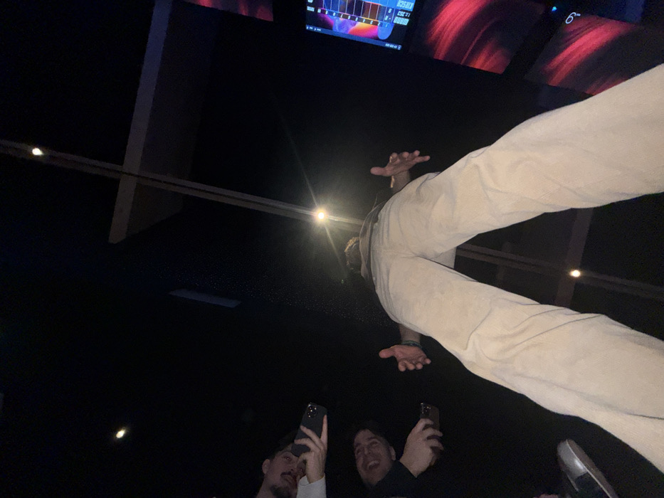 In a low-angle shot, a person wearing beige pants appears to be jumping overhead. Below, two individuals are taking pictures with their phones. The scene seems to be indoors, possibly a bowling alley, given the presence of scoring screens in the background displaying numerical data and red graphics. The lighting is dim, with a bright light fixture creating a strong glare.