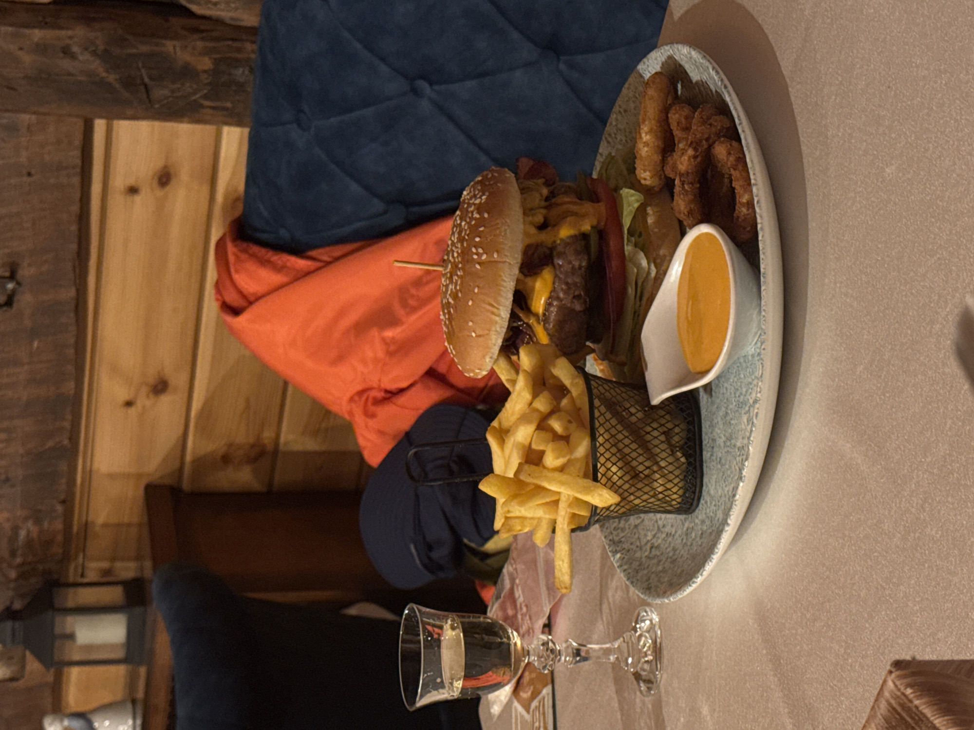 meal served on a light blue speckled plate. The meal consists of a burger held together with a toothpick, french fries in a small black wire basket, fried onion rings, and a white ramekin containing a yellow sauce. A partially filled wine glass is positioned in front of the plate. The meal is likely served at a table inside a restaurant or pub. The backdrop includes an orange jacket on a blue cushioned seat and wooden wall paneling. The location is likely in Uzice, Serbia.