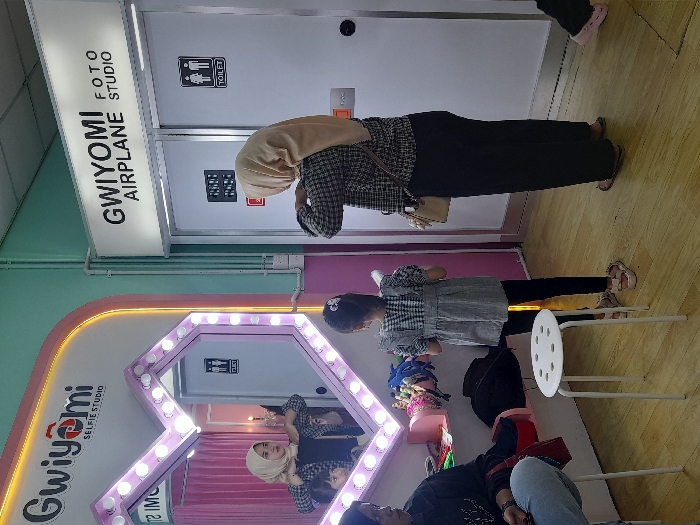 A family is in a photo booth. A girl stands next to a white stool. An older woman with a headscarf stands by a toilet door sign. A selfie studio booth with a lightbulb-framed mirror displays a woman taking a selfie, also wearing a headscarf. A man wearing a black shirt and jeans is seated nearby. The setting is a brightly lit studio.