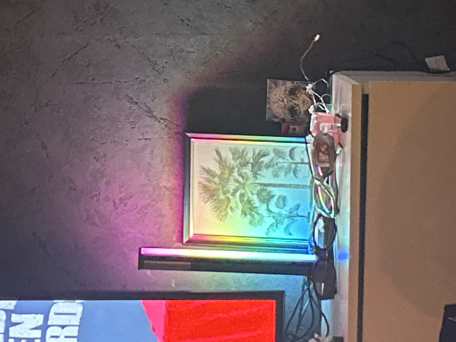 A framed botanical print featuring palm trees hangs on a textured gray wall. The frame has a rainbow-like light reflecting off it. The print sits above a black shelf with a similar rainbow light reflecting on it. To the right, a light-colored cabinet is visible. A skull-themed item, a pair of glasses, and some cables are positioned atop the cabinet, partly obscuring the artwork. The lower portion of a screen is visible, with red and blue pixels.