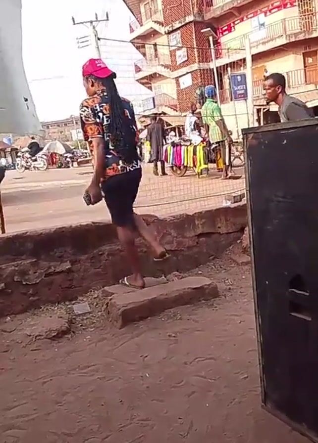 street scene with people walking on and around a low brick ledge. A person with long dark hair wearing a red baseball cap, a colorful shirt, and a short dark skirt walks along the ledge, performing a high leg kick. Another person walks along the ledge behind her, carrying a bag. A cart of colorful clothing is visible in the background, and other people are seen walking around. The background also includes buildings with multiple stories, and power lines overhead. A large, rectangular speaker sits in the foreground on the right side of the frame. The ground is a reddish-brown color, suggesting a dirt or clay surface.