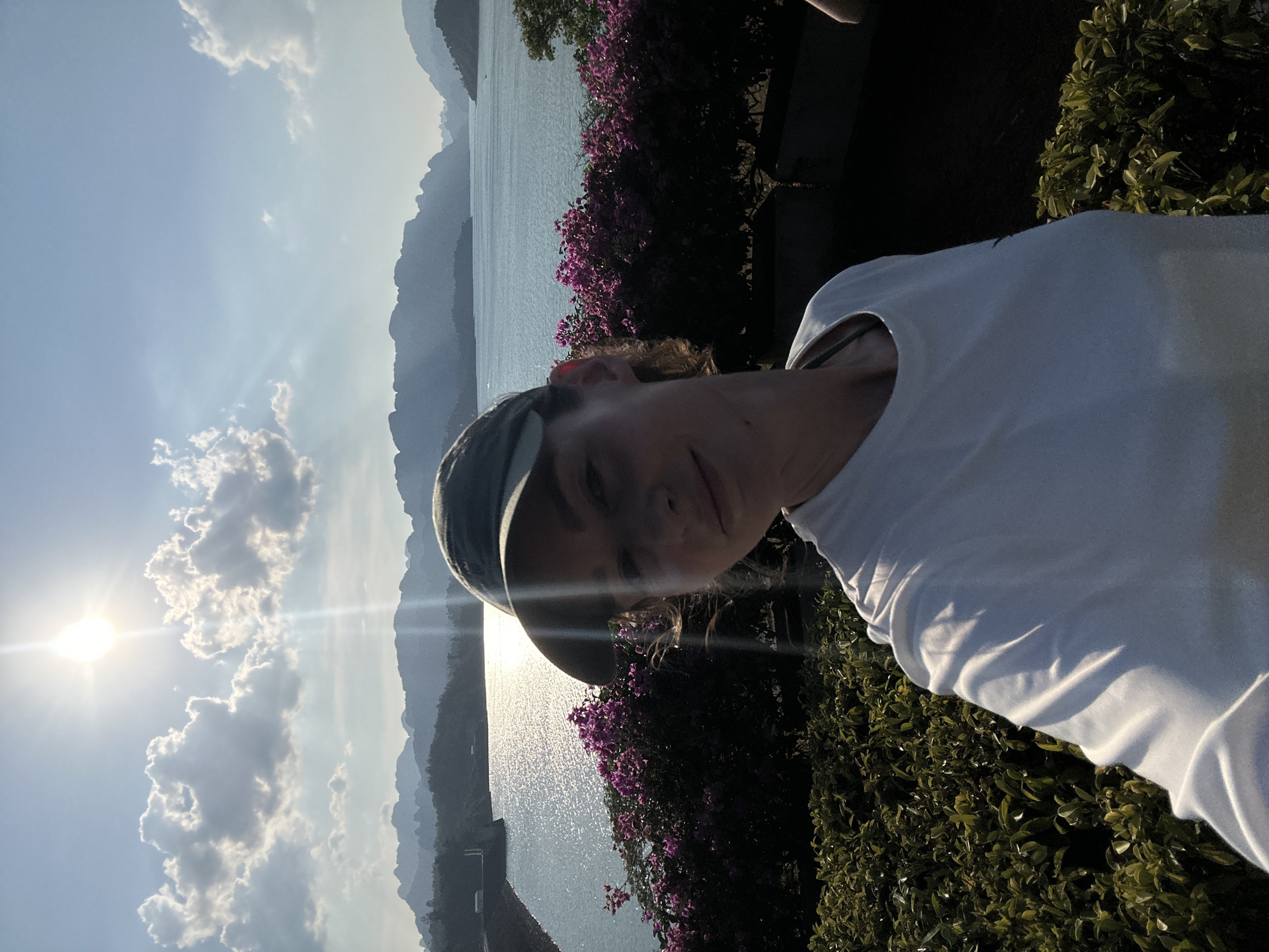 A vertical selfie taken in Khao Phang, Thailand, shows a person in a white T-shirt and baseball cap. The background features a sunlit lake, distant mountains, cloudy sky, and flowering purple bougainvillea. The person is positioned to the right, with greenery behind them. The sun's glare is visible on the lake's surface and in the sky.