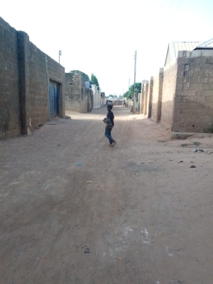 A forensic examination of the image reveals a daytime scene on an unpaved, dusty thoroughfare within the city of Unknown, Unknown. The central subject is a lone individual, identified as a young person or child, with dark skin, positioned slightly left of the image center, walking from right to left across the dirt road. This individual wears a dark long-sleeved shirt and blue trousers, and appears to be barefoot or wearing light-colored footwear. They hold a small, indistinct object in their hands. The environment consists of a narrow dirt road, characterized by light brown, dry earth with scattered small debris. The road is flanked on both sides by structures constructed primarily from unplastered concrete cinder blocks. On the left side, a prominent, tall cinder block wall features a recessed blue metal double door or gate. Further down this side, additional buildings are visible, some with lighter finishes and architectural detailing. A utility pole with wires is positioned above the left wall. On the right side, a series of similar cinder block walls line the street, some topped with corrugated metal roofs. Sunlight, appearing to originate from the right and slightly behind the viewer, casts distinct shadows from these structures onto the road. Sparse vegetation, including small trees and bushes, is observed behind the buildings in the mid-ground. The sky above is bright and largely featureless, indicating an overcast or hazy atmospheric condition. No other people or significant interactions are observed.