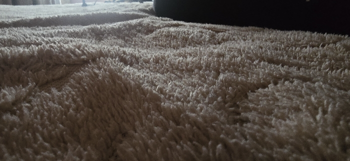 The scene is an indoor environment at an unknown location within the city of Unknown, Unknown. The image focuses on a light-colored, likely beige or off-white, shag carpet or rug, filling the majority of the frame from a low-angle perspective. The carpet exhibits long, dense, textured fibers. Lighting from the upper left illuminates the fibers and casts subtle shadows across the surface. In the background, to the upper left, faint, blurred vertical elements consistent with furniture legs are discernible against a lighter surface. To the upper right, an indistinct dark mass suggests the base of a furniture item. No people, actions, or interactions are present.