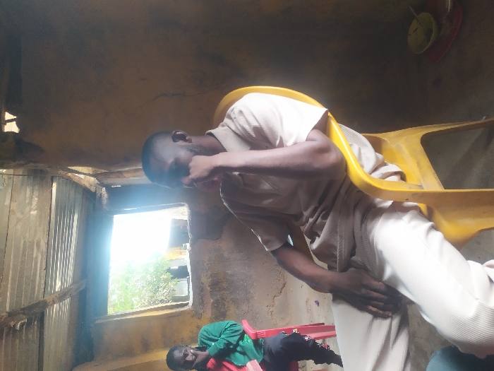 The image depicts an indoor scene within a simple structure. The exact location is unknown, but the environment features rough, light brown walls appearing to be constructed from earth or mud, and a ceiling made of corrugated metal sheets supported by wooden beams. Two adult males are present. The primary subject, positioned right of center in the foreground, is a male with dark skin and short hair, wearing a light beige short-sleeved shirt and matching trousers. He is seated in a yellow plastic chair, leaning slightly forward with his right hand touching his chin. His left arm rests on his left leg. To his left, positioned further back and partially obscured, a second male with dark skin is seated in a red plastic chair, wearing a green long-sleeved shirt and dark trousers. His hands are near his face. An open, rectangular window in the left wall serves as the main light source, casting strong glare and revealing external greenery. The interior of the room is dimly lit, with shadows dominating. In the lower right corner, on the floor, a yellow bowl containing a substance and a spoon rests on a red plate or mat. Both individuals are seated and appear to be in a contemplative or waiting state; no direct interaction between them is depicted.