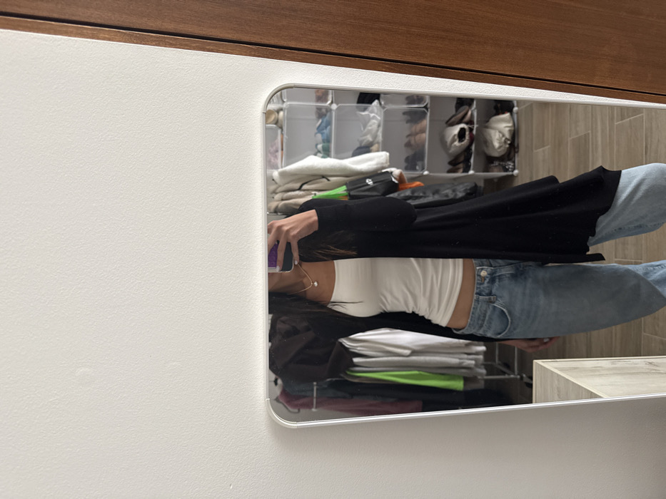 A mirror reflects a woman's selfie. She is wearing a white crop top, a black cardigan, and light blue jeans. A white storage cube with shoes sits behind her. There are several clothing items, including t-shirts, visible in the reflection, stacked on a table, or shelf. The mirror is rectangular with rounded corners and is mounted on a white wall below a wooden shelf.
