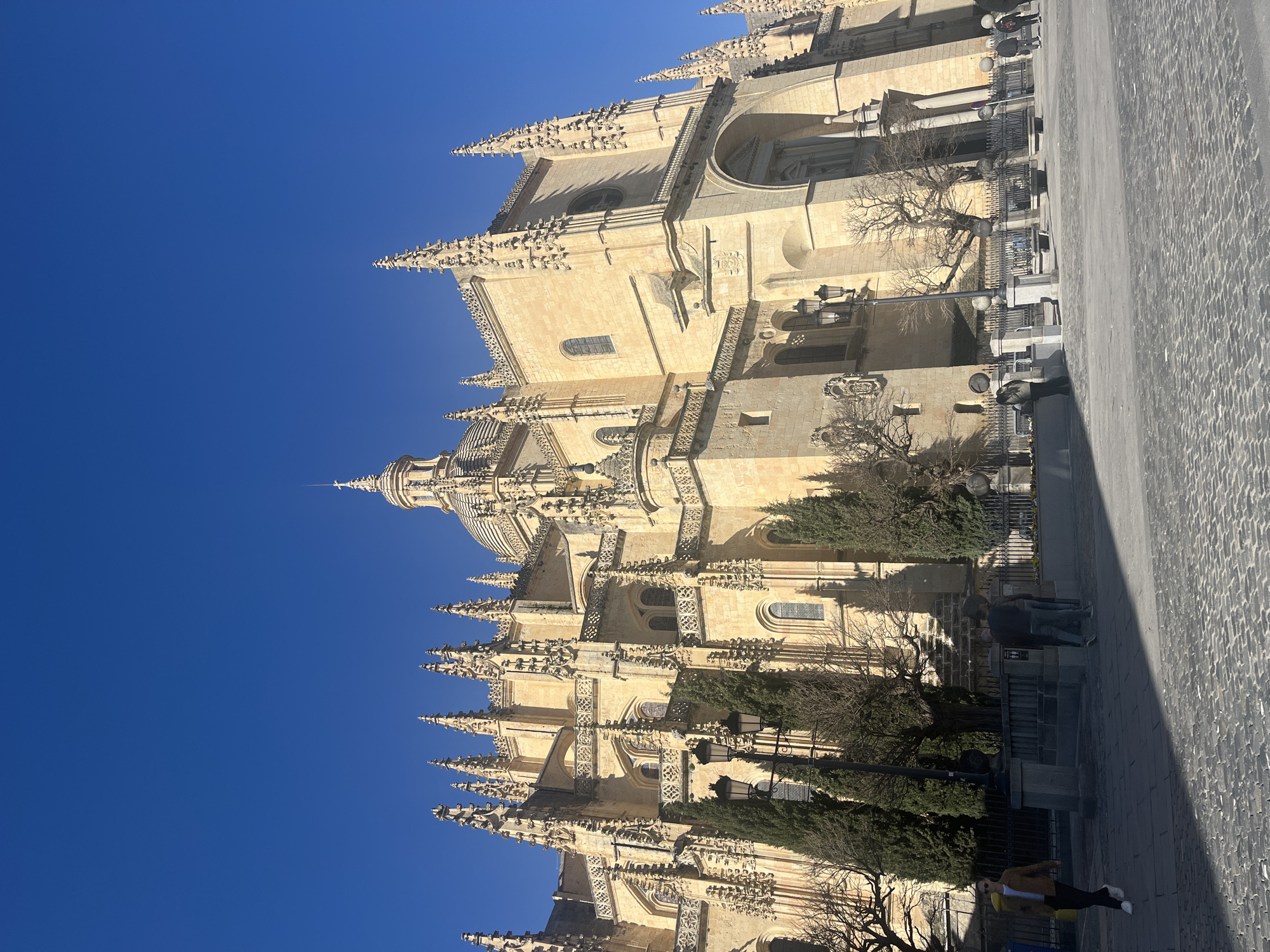 The image captures a wide view of the Segovia Cathedral, located in Segovia, Spain, under a clear, bright blue sky. The cathedral, built from light-colored stone, dominates the frame, showcasing its Gothic architectural style characterized by numerous spires, flying buttresses, pointed arches, and intricate carvings. A large, ornate Renaissance-style dome with a cupola and a cross finial is prominently featured towards the center-top. In the foreground, the ground consists of a paved area transitioning into cobblestone, exhibiting a distinct diagonal shadow line running from the lower left to the upper right. Several tall, slender, dark green coniferous trees are positioned in a row along the base of the cathedral's facade, interspersed with bare deciduous trees. Multiple ornate black streetlights with multi-lamp fixtures are visible among the trees and along the edge of the paved area. A black metal fence, topped with decorative elements, separates the main plaza from a slightly raised area closer to the cathedral. Stone benches are discernible behind this fence. Seven individuals are present. On the far left, a person wearing a light brown jacket, dark pants, and white shoes walks towards the left. In the mid-ground, a group of three individuals is partially obscured behind the metal fence and trees. Further right, two additional figures are visible in the distance, walking near the cathedral's entrance. All individuals appear to be casually dressed, and their actions consist of walking or standing within the plaza environment. The scene is brightly illuminated by natural sunlight, casting sharp shadows.