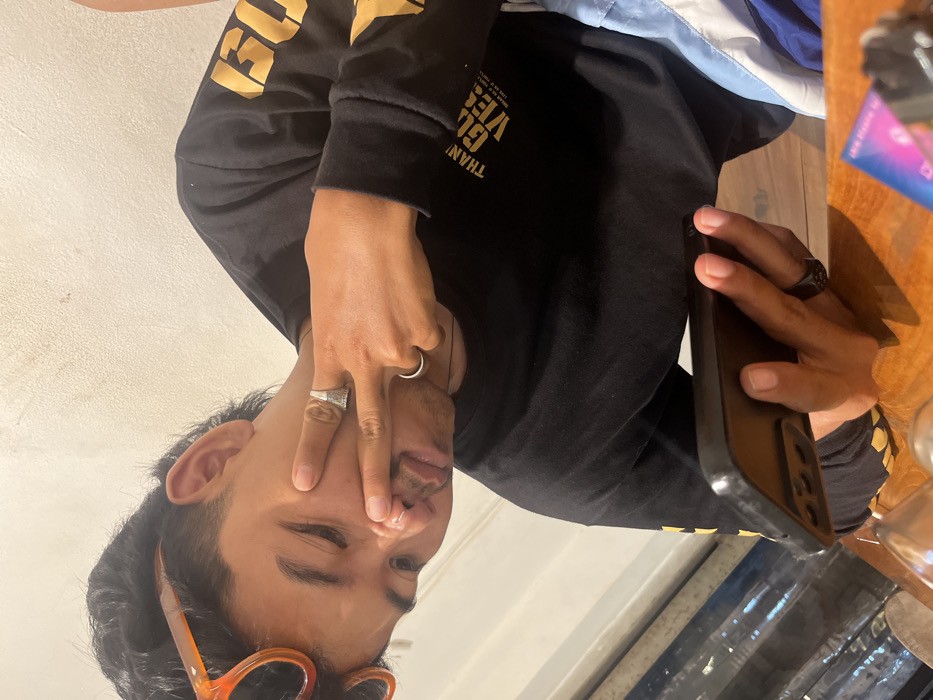 An individual is depicted indoors in Kerambitan, Indonesia, seated at a wooden table. The subject, appearing male, with dark hair styled with a fade and longer back, wears orange-tinted sunglasses pushed onto their head. They are dressed in a black long-sleeved shirt with gold lettering, including "THANK" and "GIVE," and light blue and white shorts. The subject's left hand, adorned with a patterned silver ring on the ring finger and a plain silver band on the middle finger, performs a V-sign gesture with the index and middle fingers touching the left side of their face and nose. Their right hand, wearing a black ring on the ring finger, holds a dark-cased smartphone horizontally. The subject's gaze is directed downwards and to the left. The background consists of a plain, light-colored wall. On the wooden table, partially visible, are two clear glass objects and a small rectangular object exhibiting a blue-to-purple gradient.