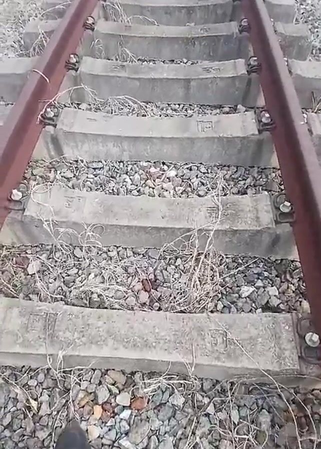 A first-person perspective video shows a pair of black shoes walking along a railroad track