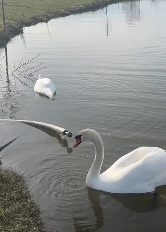 body of water that appears to be a pond or a small lake. Two white swans are present in the water. One swan is closer to the edge of the pond and is actively facing the camera. The other swan is farther away. A long, cylindrical object, possibly a pipe, is floating in the water between the swan nearest the camera and the edge of the pond. The edge of the pond is grassy. Trees and a building can be seen in the background. The weather appears to be sunny and calm, as evidenced by the reflection of the sky in the water. There are no people visible in the video, but someone is speaking, possibly a child.