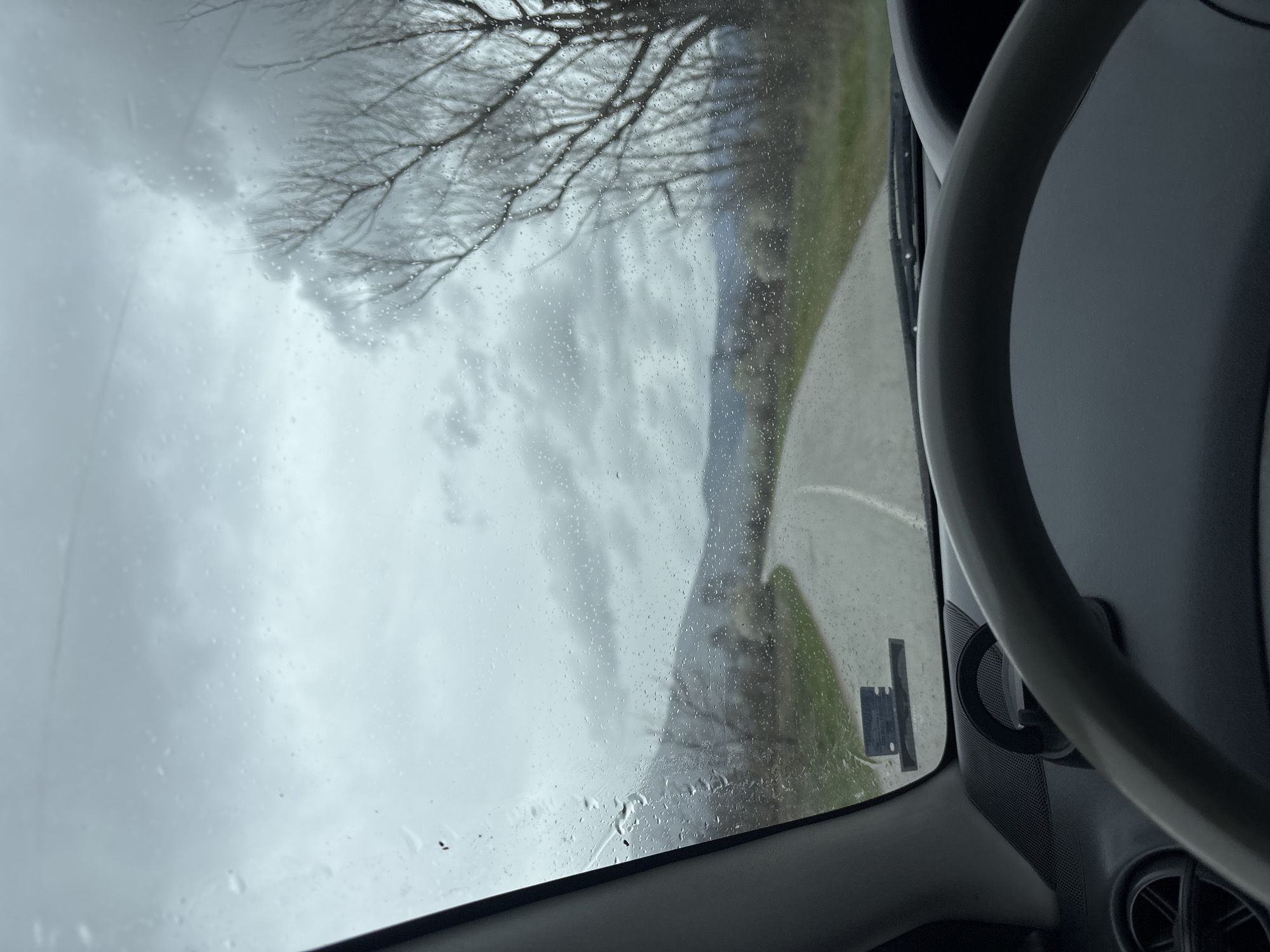 The image is an interior view from a car windshield on a rainy day. The scene outside the car features a gray sky, tree branches without leaves, a road, and some greenery. The raindrops are visible on the windshield. Inside the car, part of the dashboard and steering wheel are visible. While I cannot determine the specific location in the city of Orizari, Bulgaria, the presence of a road and greenery suggests a location possibly on the outskirts of the city.
