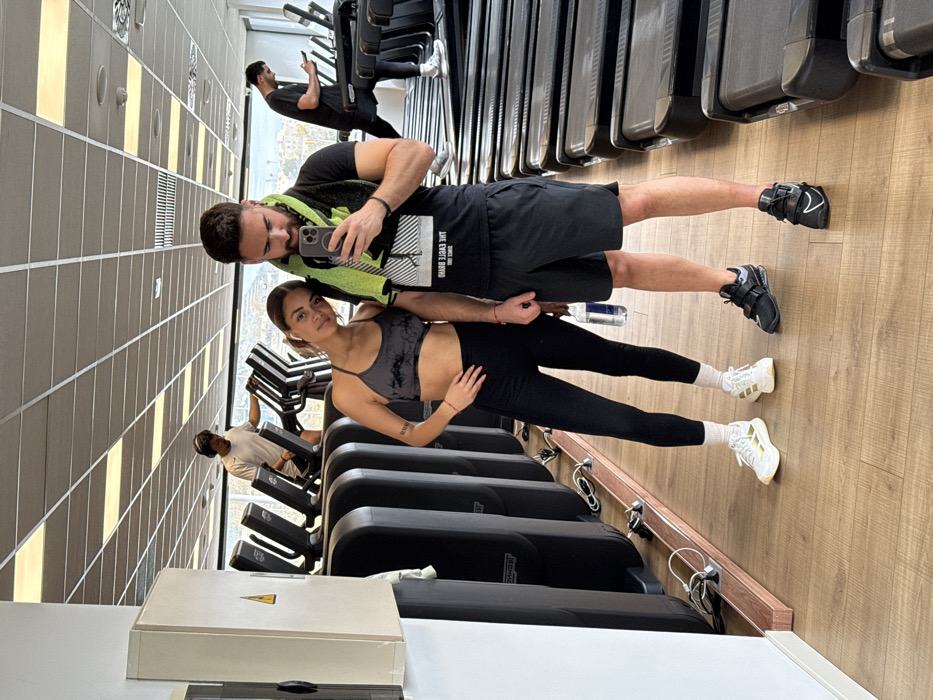 An interior view of a modern gymnasium depicts a male and female subject posing for a selfie in the foreground, with other individuals engaged in exercise activities in the background