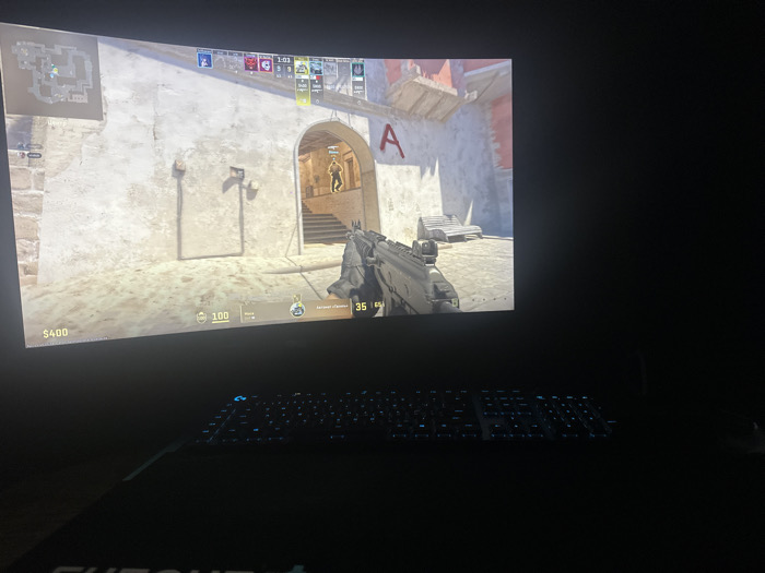 - "A curved computer monitor dominates a darkened room, actively displaying a first-person perspective of the video game Counter-Strike on the "Inferno" map" by FM-qEm5e2, licensed under CC BY 4.0