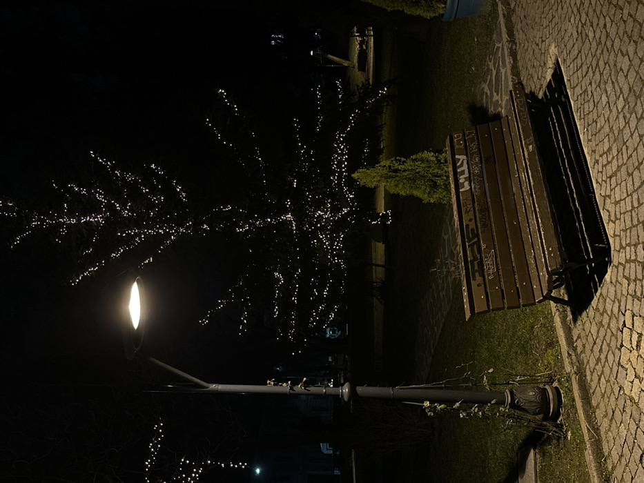 The image captures a nighttime scene within a public park in Sofia, Bulgaria. The foreground features a section of illuminated cobblestone pavement and an empty, dark brown wooden park bench exhibiting graffiti on its backrest. To the left, a modern streetlamp with a bright, warm-toned light stands, its base partially entwined with dried plant vines. Adjacent to the streetlamp, a large tree, likely an evergreen, is extensively decorated with numerous small white string lights that illuminate its branches. A smaller, conical evergreen shrub is positioned between the bench and the lit tree. In the darker midground and background, areas of grass are visible, along with a winding pathway composed of irregularly shaped lighter paving stones. Distant, blurry lights suggest other urban structures or park features. The overall environment is dark, characteristic of nighttime conditions, with no individuals or active interactions present.