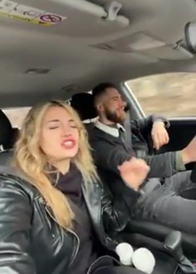 couple in a car singing along to music. The woman, with blonde hair and wearing a black leather jacket, is in the passenger seat and looking at the camera while singing. The man, with a beard and wearing a dark jacket over a white shirt, is driving and also singing. There are two white objects on the back seat that appear to be egg-shaped. The car seems to be driving on a road with trees visible outside.