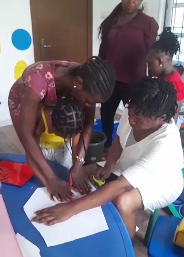 A group of people are gathered around a small blue table in what appears to be a classroom. Three adults are present: two women are seated, and one is standing. A young child in a yellow top stands at the table, and another child in a red shirt stands behind the woman who is standing. The woman who is standing is helping the child make red handprints on a white piece of paper. The second seated woman is cutting something with scissors. There is a small black bucket on the floor next to the table, and a red tray with red paint on the table. The walls of the room are white, decorated with colorful shapes. There is a door visible in the background, and a whiteboard with the words "Days of the Week" on it. The room seems to be well lit.