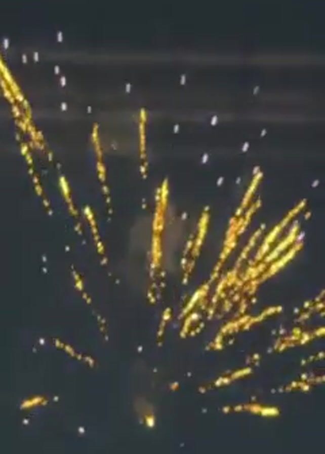 dark blue night sky in which a yellow firework explodes three times. The explosions create bright, star-like bursts that dissipate into smaller sparks. There are some faint white lines in the background. The roof of a building is partially visible at the bottom of the frame.