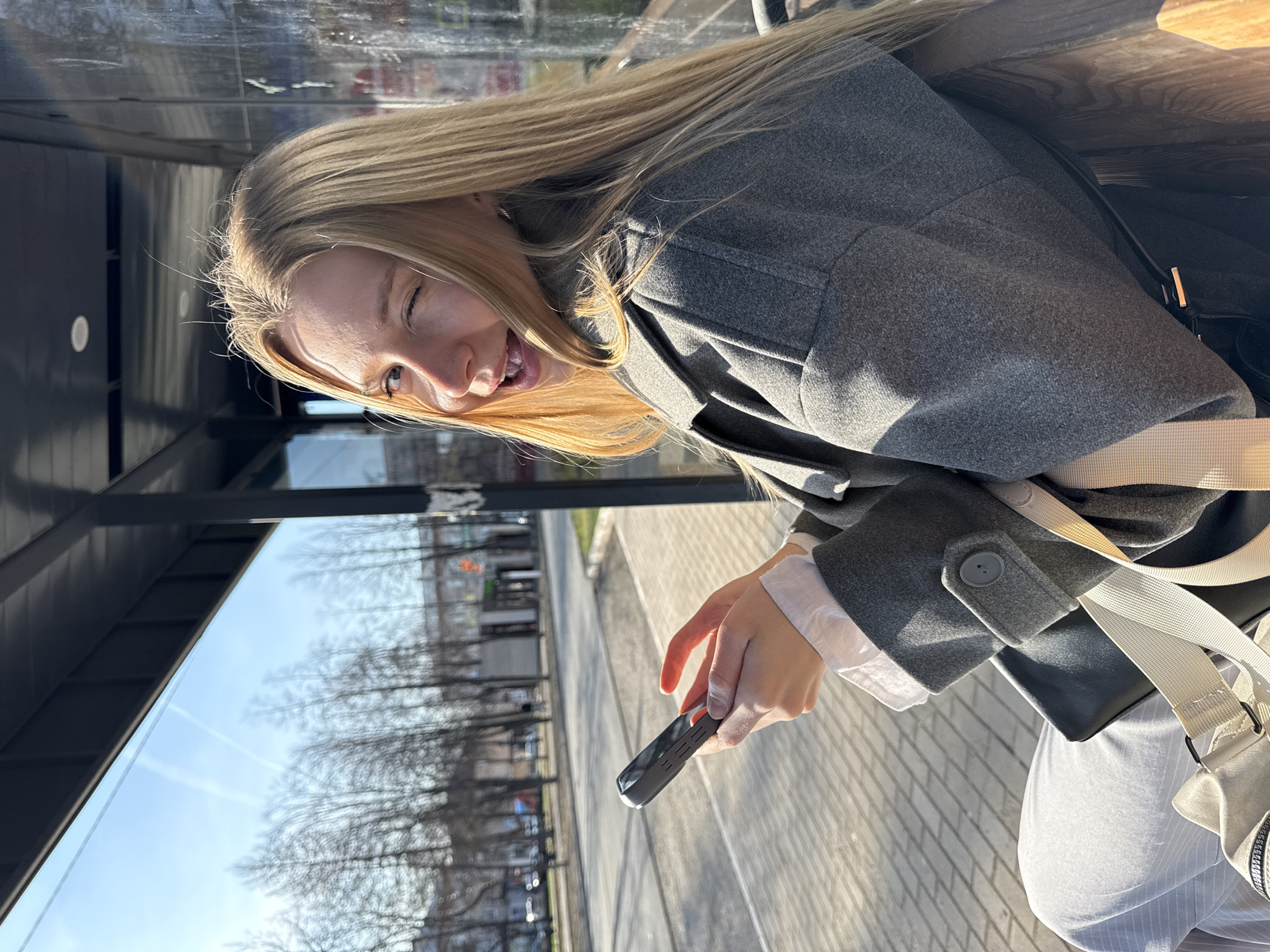 A young woman with long blonde hair is sitting at a bus stop in the city of Chaikovsky, Russia. She is wearing a gray coat over a white shirt and light-colored pants. She has a bag with a beige strap slung across her body. In her hands, she is holding a black object, possibly a phone or other electronic device. The bus stop has a glass shelter, reflecting the outdoor environment, including trees and buildings across the street. The weather appears sunny and the scene is well-lit. The ground is paved with light-colored bricks.