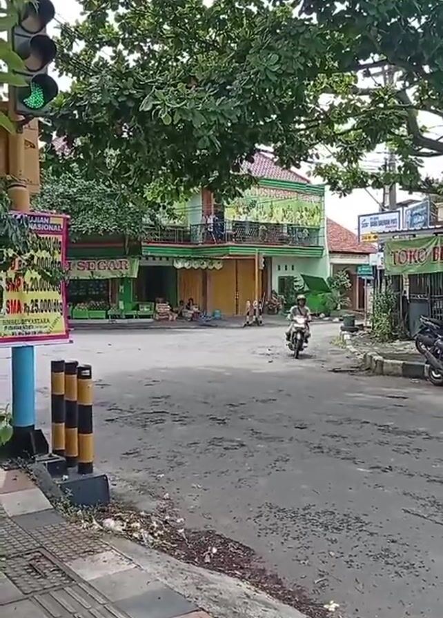 The camera is stationary and displays a view of an intersection in what appears to be a small town or village. There is a traffic light showing green, with a sign attached to its post on the left side of the frame. The sign advertises courses or tuition. Across the intersection is a two-story green building with a business on the first floor. Several people are sitting at tables in front of the business. To the right, a small shop with the name "Toko" on its awning is visible. The road is asphalt with signs of wear and tear. A motorcycle is seen driving through the intersection. The environment is lush with trees providing shade. A sidewalk runs along the bottom of the frame, with litter scattered along the edge. The sky is overcast, suggesting a cloudy day.