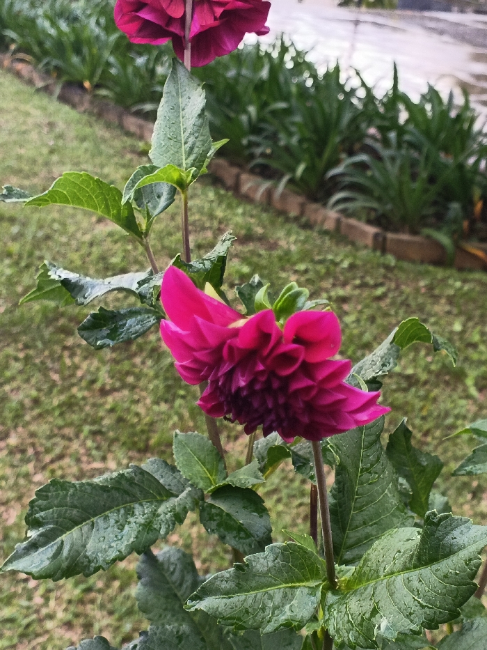 An outdoor scene captures two dahlia flowers with magenta to dark pink petals, displaying visible water droplets consistent with recent precipitation or watering. The lower, more prominent flower is in sharp focus, angled towards the left, showcasing densely packed, ruffled petals. A second, partially visible flower of similar color appears at the top center of the frame. Both flowers stem from green stalks adorned with broad green leaves, which also bear water droplets. The immediate foreground consists of blurred green grass. In the midground, a manicured garden bed features rows of uniformly planted green foliage, delineated by a low, brown border constructed from rectangular paver-like stones. Beyond this garden bed, the far background shows a blurred, wet, light-colored surface, possibly a road or path. No individuals or specific identifying city landmarks are present; therefore, the location as Akshatau, Kazakhstan, cannot be visually confirmed.