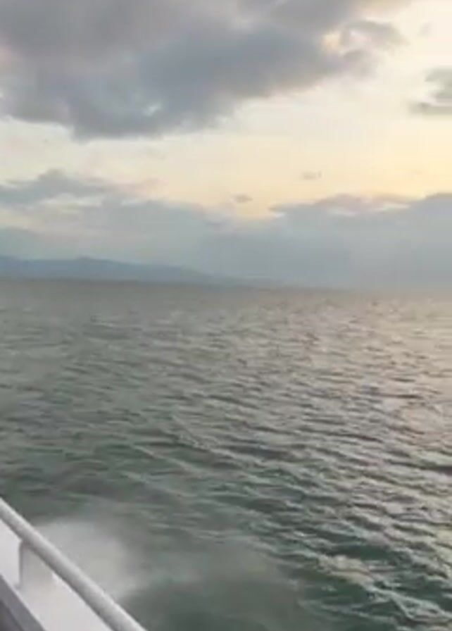 sea view from the side of a moving boat. The sky is cloudy, with the sun setting. In the distance, land is visible as well as a few small islands and another boat. The water is choppy, with a visible wake trailing the boat from which the video is being filmed. The boat's white railing and blue side panel are in the lower left of the frame.
