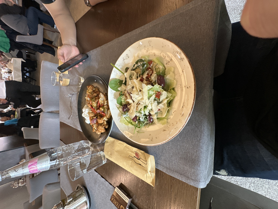 This image depicts an indoor restaurant setting in Vratsa, Bulgaria, viewed from a seated perspective at a table. The foreground features a dark wooden table covered by a grey fabric runner. On the table, from left to right, are: a silver caddy containing salt and pepper shakers; a brown rectangular packet labeled "TEREA"; a clear glass filled with water; a tall, clear plastic bottle of "Benedetto Elite" mineral water; and a light brown paper sleeve with a red wine bottle illustration. A dark, round plate holds a main course of stir-fried chicken with red and green bell peppers and red onions, accompanied by a small mound of white rice. Next to this, a clear glass contains a light yellow beverage. A prominent white ceramic plate with a textured rim displays a salad composed of mixed green leaves, dark olives, small pieces of sun-dried tomato, and generous shavings of parmesan cheese, dressed with a light sauce. A person's legs, clad in dark blue distressed jeans, are visible beneath the table. On the right side of the table, a person's right arm and hand are visible, holding a black smartphone vertically. In the blurred background, several other tables are occupied by patrons. Light grey upholstered chairs are visible. One individual in a white shirt and black trousers, possibly a waiter, stands in the mid-ground. The overall environment suggests a casual dining establishment with neutral-toned walls and ample lighting.