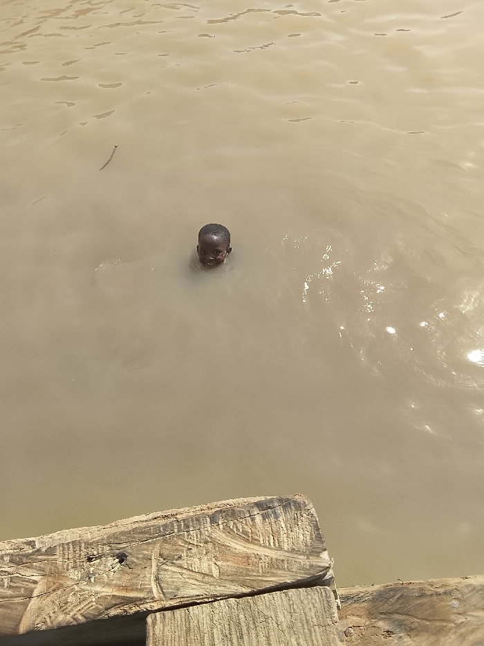 A young child is partially submerged in turbid, light brown water, with only their head visible above the surface, looking forward with a slight smile. The child has dark skin and short dark hair. The water exhibits minor ripples and specular reflections from sunlight. A thin, dark, elongated object floats in the water to the upper left. In the immediate foreground, a weathered wooden structure, composed of rough, light-colored planks or logs, is partially visible at the water's edge. This scene is located in Ibi, Nigeria.