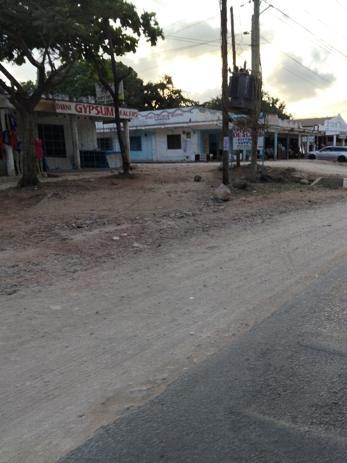 A street scene shows a row of single-story buildings with storefronts on the left side of the frame. The building closest to the viewer has "DIANI GYPSUM DEALERS" written on it. Trees sparsely dot the area in front of the buildings. Utility poles with electrical equipment stand near the street. A car is visible in the distance on the right side of the image. The street transitions from a paved surface to a dirt shoulder in the foreground.