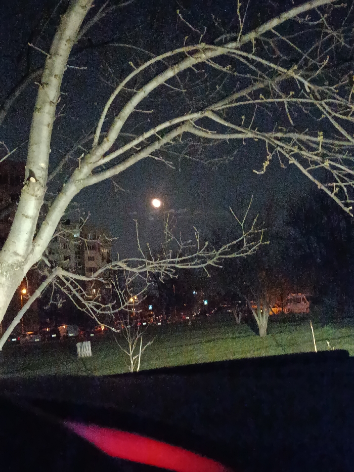 The image depicts a nighttime urban scene in Sofia, Bulgaria. A large, deciduous tree with a light-colored, multi-branched trunk and visible buds on its bare branches dominates the left foreground and extends across the upper portion of the frame. In the dark sky, a bright, circular celestial object is positioned in the upper-middle. Below the tree and extending to the right, a sloping grassy area is partially illuminated, containing several smaller, leafless trees. Beyond this green space, a street is visible, populated by numerous vehicles indicated by white headlights and red taillights. Streetlights cast an orange glow, and multiple blue and white pedestrian crossing signs are discernible along the street. A white van is parked or moving on the right side of the street, partially obscured by trees. A multi-story building is partially visible in the upper-left background behind the main tree. The immediate lower foreground consists of a dark, indistinct surface, with a prominent diagonal red light streak extending from the lower-left corner upwards to the right. No individuals are visibly present.