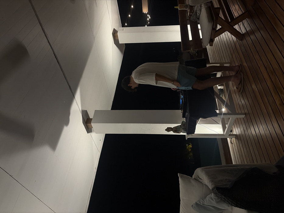 This image depicts an outdoor elevated patio or deck at night in Ayampe, Ecuador