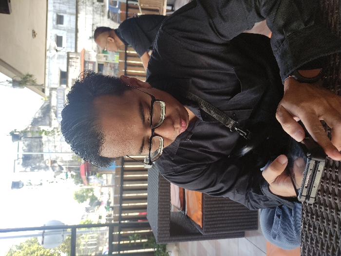 man, wearing glasses and a black shirt, sitting at a table outdoors. He is using a smartphone, which is visible in his left hand. He is facing downward towards the phone. The man's right hand is resting on the table. The table is made of wood, with a woven pattern, and a brown chair is visible to the left of the man. The environment is an outdoor patio, with plants and buildings in the background. The man is located in Jember, Indonesia, at coordinates -8.172 latitude and 113.698 longitude. A second man is visible in the upper portion of the photo, wearing a black shirt. The second man is partially obscured by a pillar or other obstruction, facing right with his back to the camera. He is wearing a black shirt and appears to be holding or looking at something in his hands. The second man is walking away from the camera. There is a partially obstructed view of the city's buildings in the background, as well as a partially obscured view of a sky.
