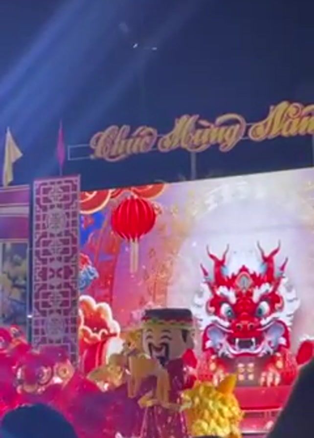 stage performance with a group of performers in costumes. A red and gold dragon costume is prominently displayed on stage with red and white lion costumes performing in the foreground. A character wearing traditional clothing with a large head dances between the lion costumes. The stage backdrop features the words "Chúc Mừng Năm" in gold lettering, along with a red lantern and digital cloud decorations. The performance is taking place at night under bright lights. The audience is visible in the lower part of the frame.