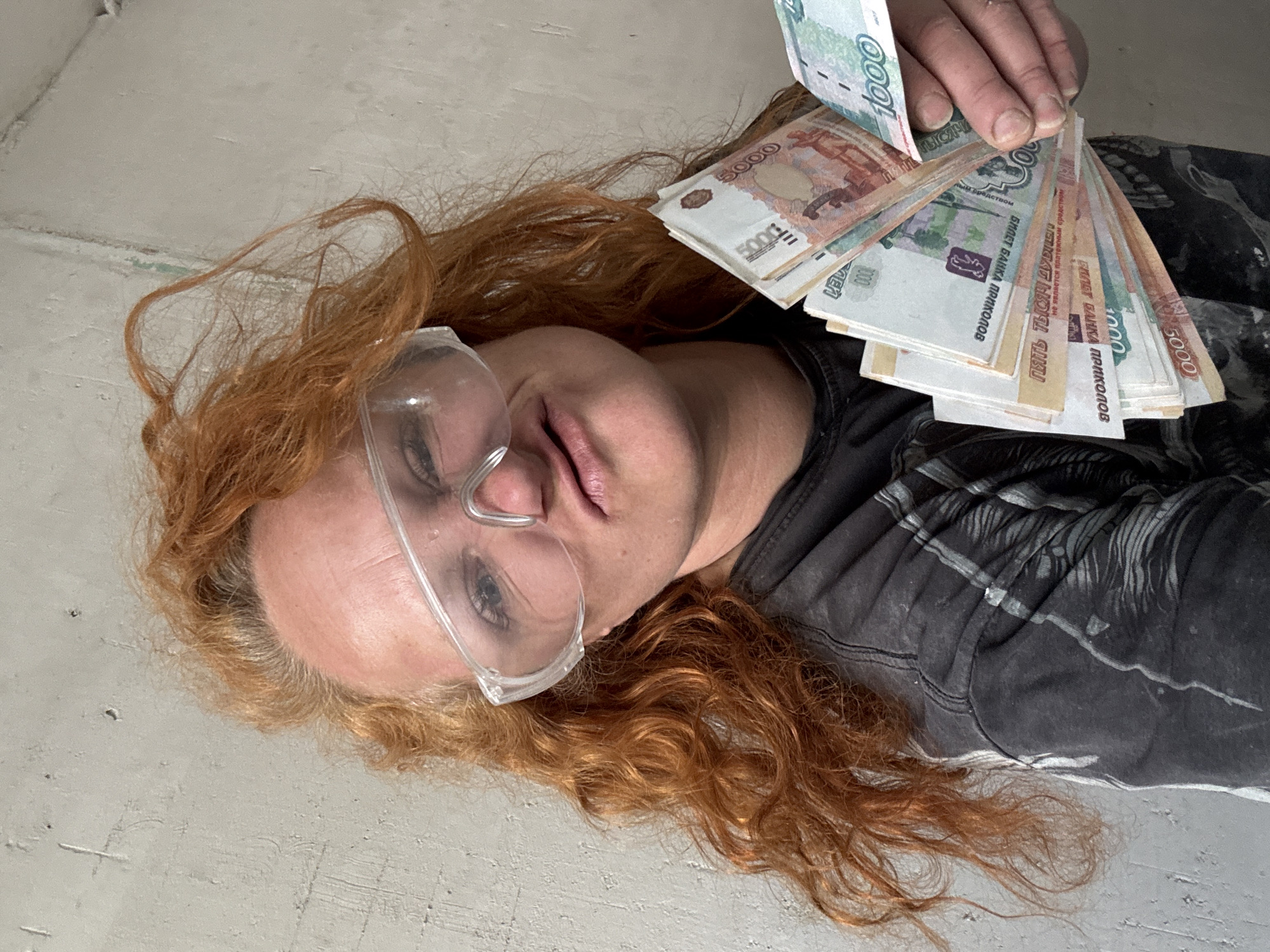 A woman with red hair and safety glasses is lying on a concrete floor, holding a fan of Russian rubles. The bills are a mix of 1000 and 5000 denominations. The location is unknown and is not identifiable as Chaikovsky, Russia from the given information.