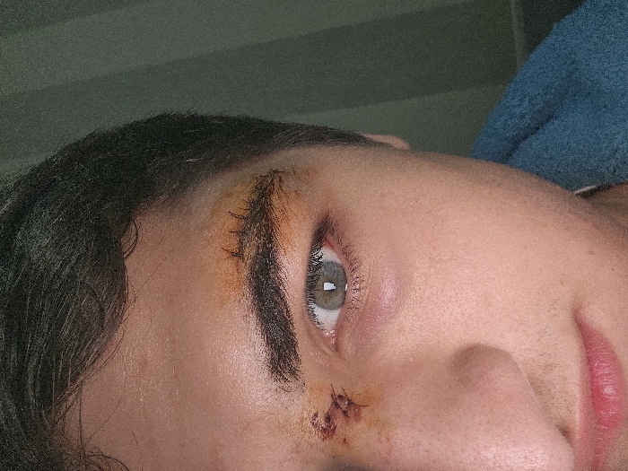A close-up, waist-up portrait shot of an individual's right facial area captures multiple lacerations and medical interventions