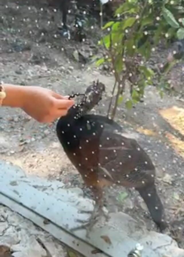 - "A person is holding a sprig of small black berries, attempting to feed a crested guan through a glass enclosure" by FM-Ft7F82, licensed under CC BY 4.0